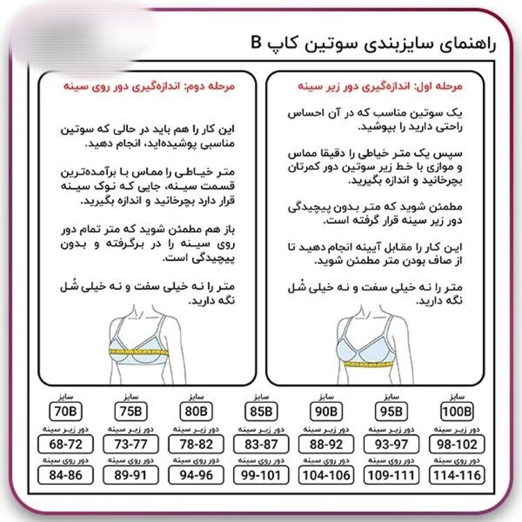 بدون فنر بدون جک مناسب برای استفاده روزانه خیلی نرم و خوش فرم خط دوخت نداره قبل از انتخاب ؛جدول سایز کاپ B را با صفحه زدن عکس ها مطالعه کنید سایز ۸۰ زیر سینه با اولین قزن ۶۲ سانت زیر سینه با آخرین قزن ۶۵سانت سایز ۸۵ زیر سینه با اولین قزن ۶۵ سانت زیر سینه با آخرین قزن ۶۸ سانت سایز ۹۰ زیر سینه با اولین قزن ۶۸ سانت زیر سینه با آخرین قزن ۷۱ سانت سایز ۹۵ زیر سینه با اولین قزن ۷۱ سانت زیر سینه با آخرین قزن ۷۳سانت لطفا قبل از ثبت سفارش راهنمای اندازه گیری مطالعه شود.